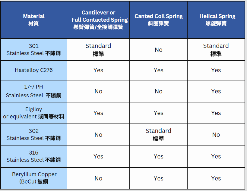 通常採用不鏽鋼和其他合金材料: 301不銹鋼、316不銹鋼、Elgiloy或同等材質、17/7PH 不銹鋼
